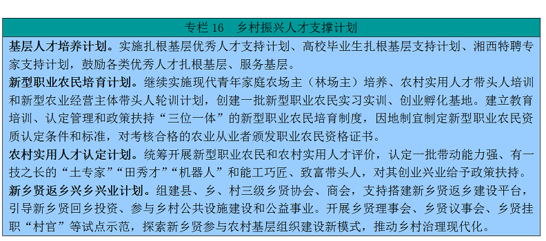 169。强化专业人才步队扶植。继续实施“扎根下层优良人才”支撑打算。落实好“三区”人才支撑打算,继续实施“三支一扶”“杰出农林人才教育培育打算”“农村订单定向医学生、师范生免费培育”等,每年定向培育师范生8000名、医学生1500名。依托电视大学系统和职业院校培育5万名农人大学生。恰当放宽持久正在贫苦县和下层一线工做的专业手艺人才职称评定前提,侧沉现实工功课绩和办事下层年限、结果。全面奉行下层卫生专业手艺人才职称轨制。成立农村下层紧缺专业门类“定向评价、定向利用”的高级专业手艺职称评审办理轨制。逐渐实行晋升高级职称须有1年以上下层一线工做履历的要求。开展农村适用人才带头人培训,认定一批为农业出产办事带动能力强、有一技之长的“土专家”“田秀才”“机械人”,成立3个省级高尺度的农村适用人才带头人和大学生村官示范培训。实施村落工匠培育工程和农业领甲士才培育打算,搀扶培育一批农业职业司理人、经纪人、电子商务师、文化强人、非遗传人。