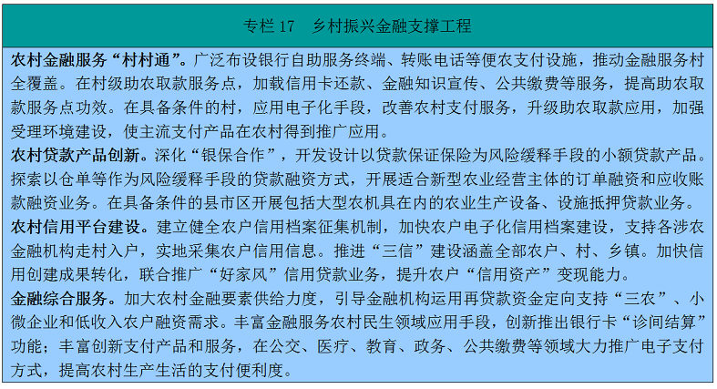 187。完美金融支农组织系统。激励各类金融机构到县和乡镇设立分支机构。加大农业银行、邮政储蓄银行对村落复兴的支撑力度。阐扬国度开辟银行、农业成长银行支撑村落复兴的职责感化,加大持久政策性信贷支撑。连结农村贸易银行县域法人地位和数量总体不变,加速农村信用社省联社。完美村镇银行准入前提,激励包罗企业法人、天然人等各类社会本钱参取村镇银行的倡议设立和增资扩股,实现村镇银行县域全笼盖。